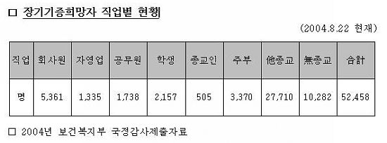 Á÷¾÷º°·Î´Â ȸ»ç¿øÀÌ 5361¸í(10.2%), ÁֺΠ3370¸í(6.4%), Çлý 2157¸í(4.1%), °ø¹«¿ø 1738¸í(3.3%), Á¾±³ÀÎ 505¸í(0.9%) µîÀ¸·Î ºÐ¼®µÅ ¼ºÁ÷ÀÚ µî Á¾±³ÀεéÀÇ Àå±â±âÁõÀÌ ÀϹÝÀκ¸´Ù ÈξÀ ÀúÁ¶ÇÑ °ÍÀ¸·Î µå·¯³µ´Ù. |