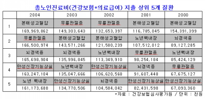 ¾È ÀÇ¿øÀº "°Ç°º¸Çè°ú ÀÇ·á±Þ¿©(Àú¼ÒµæÃþ ÀÇ·áºñ)¸¦ ´õÇÑ Àüü ³ëÀÎÀÇ·áºñÀÇ °æ¿ì, °¡Àå ¸¹Àº µ·À» ÁöÃâÇÏ´Â ÁúȯÀº °íÇ÷¾Ð, ¹«¸°üÀýÁõ, ³ú°æ»ö, ¸¸¼º ½ÅÀå±â´É»ó½Ç, ³ë³â ¹é³»ÀåÀ¸·Î ³ªÅ¸³µ´Ù"¸ç "¼øÀ§¿¡´Â ´Ù¼Ò º¯µ¿ÀÌ ÀÖÁö¸¸ 2000³â ÀÌÈÄ ÁÙ°ð À̵é 5°³ ÁúȯÀÌ ³ëÀÎÁø·áºñ »óÀ§ 5°³ Áúȯ ÀÚ¸®¸¦ Â÷ÁöÇß´Ù"°í ¼³¸íÇß´Ù.