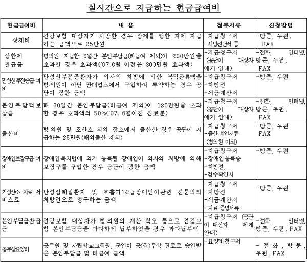 °ø´ÜÀÌ ½Ç½Ã°£ Áö±Þ¼ºñ½º¸¦ Á¦°øÇÏ´Â Çö±Ý±Þ¿©ºñ´Â ÀåÁ¦ºñ, »óÇÑÁ¦ ȯ±Þ±Ý, ¸¸¼º½ÅºÎÀü ±Þ¿©ºñ, º»Àκδã¾×º¸»ó±Ý, Ãâ»êºñ, Àå¾ÖÀκ¸À屸 ±Þ¿©ºñ, °¡Á¤»ê¼Ò Ä¡·á ¼ºñ½º·á, º»Àκδãȯ±Þ±Ý, °ø¹«»ó¿ä¾çºñ µîÀÌ´Ù.
