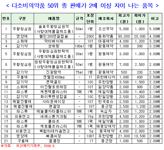 ´Ù¼ÒºñÀǾàǰ 50ǰ¸ñ¿¡ ´ëÇÑ ÃÖÀú, ÃÖ°í°¡°ÝÀ» ºñ±³ÇÑ °á°ú¿¡¼µµ 2¹è ÀÌ»ó ³ª´Â ǰ¸ñÀÌ 21°³(42%)¿¡ ´ÞÇß´Ù.