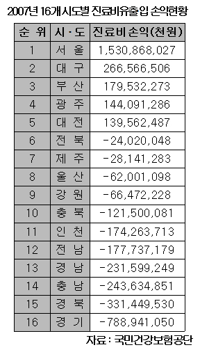 ±¹¹Î°Ç°º¸Çè°ø´ÜÀÇ '2007³â 16°³ ½Ãµµº° Áø·áºñ À¯Ã⡤ÀÔ ¼ÕÀÍÇöȲ'[Ç¥]¿¡ µû¸£¸é ¼¿ïÀº Áö³ÇØ Áø·áºñ ¼ÕÀÍ¿¡¼ 1Á¶5308¾ï¿©¿øÀÇ ÀÌÀÍÀ» ±â·ÏÇß´Ù.