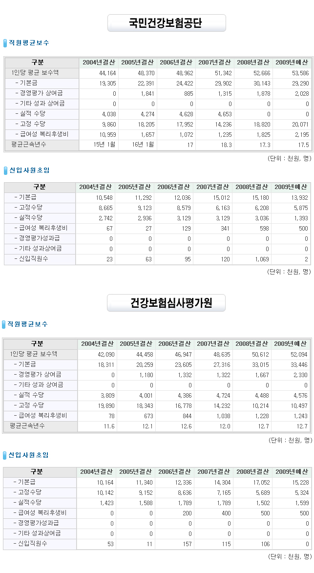 ÀÌ ÀÚ·á¿¡ µû¸£¸é ±¹¹Î°Ç°º¸Çè°ø´Ü Á÷¿øÀÇ 2008³â Æò±Õ¿¬ºÀÀº 5266¸¸¿øÀ̾úÀ¸¸ç °Ç°º¸Çè½É»çÆò°¡¿ø Á÷¿øÀº Áö³ÇØ Æò±Õ 5061¸¸¿øÀÇ ¿¬ºÀÀ» ¹ÞÀº °ÍÀ¸·Î Áý°èµÆ´Ù.