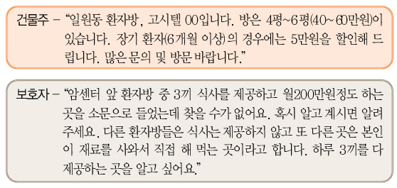 ȯÀÚµéÀÌ ÀÌ º´¿øµé ±Ùó¿¡ ¼÷¼Ò¸¦ Àâ±â´Â ½±Áö ¾Ê´Ù. ±æ°í Áö·çÇÑ ¾Ï Åõº´ °úÁ¤¿¡¼ Ä¡·á¸¦ ¹ÞÀ» ¶§¸¶´Ù ¼¿ï¿¡ »ç´Â Ä£ÀÎô¿¡°Ô µµ¿òÀ» ±¸Çϱ⵵ ¹Ì¾ÈÇÑ ÀÏÀÌ´Ù. ¼÷¼Ò°¡ ¹Ù·Î º´¿ø ±Ùó°¡ ¾Æ´Ï¸é Ä¡·á¸¦ ¹ÞÀº µÚ ÈÖÀû´ë´Â ¸öÀ» ²ø°í °¡±â¿¡µµ ÁøÀÌ ºüÁø´Ù. ÀÏ¹Ý ¼÷¹Ú¾÷¼Ò¿¡ ¹¬±âµµ ¿©ÀÇÄ¡ ¾Ê´Ù. ±æ°Ô´Â ÇѵΠ´Þ¾¿ ¸Ó¹«¸£´Â ¾Ï ȯÀÚ¸¦ ´Þ°¡¿ö ÇÒ ¸® ¾ø±â ¶§¹®ÀÌ´Ù.
