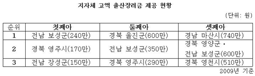 µÑ°¾ÆÀÌ¿Í ¼Â°¾ÆÀÌ Ãâ»êÀå·Á±ÝÀ¸·Î °¢°¢ 350¸¸¿ø°ú 600¸¸¿øÀ» Á¦°øÇϰí ÀÖ´Â Àü³² º¸¼º±º ¶ÇÇÑ Ãâ»ý¾Æ ¼ö´Â ¿ªÇàÇß´Ù. 2009³â 366¸í, 2008³â 414¸íÀ¸·Î 48¸íÀÌ ÁÙ¾îµé¾ú´Ù.