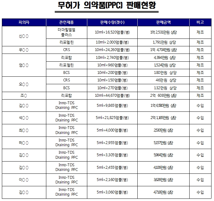 ½ÄǰÀǾàǰ¾ÈÀüû À§ÇØ»ç¹üÁß¾ÓÁ¶»ç´ÜÀº 16ÀÏ ¡°ÀÏ¹Ý ÈÀåǰÀ¸·Î ¼öÀÔ¡¤Á¦Á¶µÈ 6Á¾ÀÇ Á¦Ç°À» »ì »©´Â ÁÖ»çÁ¦(ÀǾàǰ)·Î µÐ°© ÆÇ¸ÅÇÑ 13°³ ¾÷ü¿¡ ´ëÇØ ¾à»ç¹ý À§¹ÝÇøÀÇ·Î ¼¿ïÁß¾ÓÁö°Ë¿¡ ¼ÛÄ¡Çß´Ù¡±°í ¹àÇû´Ù.