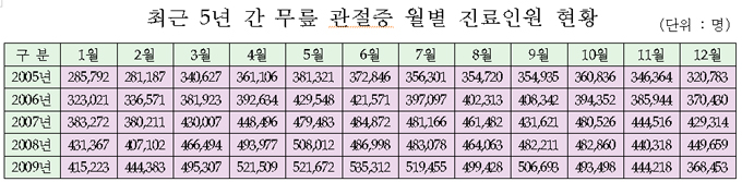 °Ç°º¸Çè½É»çÆò°¡¿ø(¿øÀå °À±±¸)ÀÇ ÃÖ±Ù 5³â°£(2005~2009³â) ¹«¸°üÀýÁõ ½É»ç°áÁ¤ÀÚ·á[Ç¥ÂüÁ¶]¸¦ ºÐ¼®ÇÑ °á°ú, ³¯¾¾°¡ µû¶æÇØÁö´Â 3¿ù ~ 5¿ù¿¡ Å« ÆøÀÇ Áõ°¡À²À» º¸¿´´Ù.
