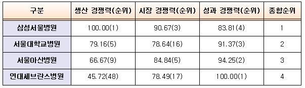 Àüü 3°³(»ý»ê, ½ÃÀå, ¼º°ú)ÀÇ °æÀï·ÂÀ» ´ëº¯ÇÏ´Â 11°³ ÁöÇ¥ÀÇ °æÀï·Â Á¾ÇÕ¼øÀ§´Â »ï¼º¼¿ïº´¿øÀÌ 1À§, ¼¿ï´ëÇб³º´¿ø 2À§, ¼¿ï¾Æ»êº´¿ø 3À§, ¼¼ºê¶õ½ºº´¿øÀÌ 4À§¿´´Ù.