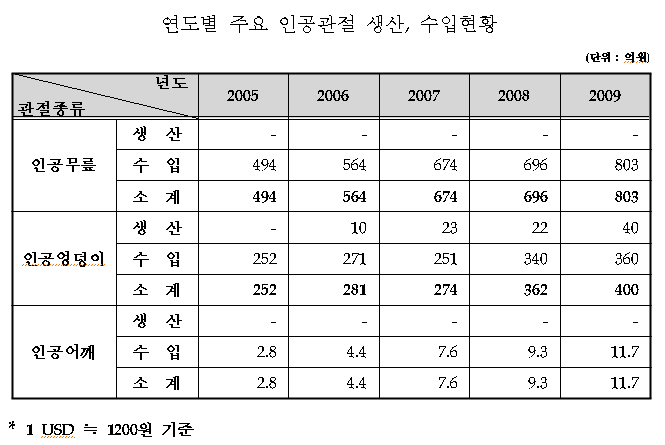 Àΰø ¾ûµ¢À̰üÀýÀº ÅðÇ༺ º´º¯, °ñÀý ¹× Á¾¾ç µîÀ¸·Î ÀÎÇØ º´º¯ÀÌ ¹ß»ýÇÑ ¾ûµ¢À̰üÀýÀ» ´ëüÇÒ ¸ñÀûÀ¸·Î »ç¿ëµÇ¸ç, ¿¬Æò±Õ ¾à 8%ÀÇ ¼ºÀåÀ» º¸¿´´Ù. ½ÃÀå±Ô¸ð(¡®09³â ±âÁØ)´Â ¾à 400¾ï¿øÀ» Â÷ÁöÇß´Ù.