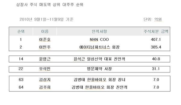 ÇÑÆí, Àüü ±â¾÷À» ºÃÀ» ¶§ NHN ÀÌÁØÈ£ COO°¡ ÃÑ ÁÖ½ÄóºÐ ±Ý¾×ÀÌ 407¾ï 1õ¸¸¿øÀ» ¸ÅµµÇØ ÃÖ»óÀ§¿¡ ·©Å© µÆ´Ù.