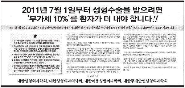 ´ëÇѼºÇü¿Ü°úÇÐȸ¤ý´ëÇѼºÇü¿Ü°úÀÇ»çȸ¤ý´ëÇѹ̿뼺Çü¿Ü°úÇÐȸ¤ý´ëÇѵΰ³¾È¸é¼ºÇü¿Ü°úÇÐȸ´Â 24ÀÏ Àϰ£Áö¸¦ ÅëÇØ ¡°2011³â 7¿ù 1ÀϺÎÅÍ ¼ºÇü¼ö¼úÀ» ¹ÞÀ¸·Á¸é ¡®ºÎ°¡¼¼ 10%¡¯¸¦ ȯÀÚ°¡ ´õ ³»¾ß ÇÑ´Ù¡±´Â Á¦ÇÏÀÇ ±¤°í¸¦ °ÔÀçÇß´Ù.
