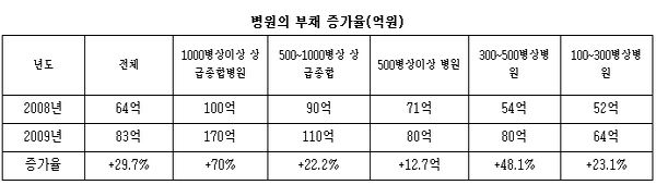 »ó±ÞÁ¾ÇÕº´¿ø°ú 300¡500º´»ó »çÀÌÀÇ Á¾ÇÕº´¿øÀÇ °æ¿ì 2009³â°ú 2008³âÀ» ºñ±³ÇÒ ¶§ °¢°¢ 70%¿Í 48.1% ºÎä°¡ Áõ°¡Çß´Ù.