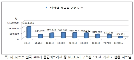 ¿¬º¸¿¡ ³ªÅ¸³ Àü±¹ ÀÀ±Þ½Ç 593 °÷ Áß 133°³ ÀÀ±ÞÀÇ·á±â°üÀÌ µî·ÏµÈ NEDIS(ÀÀ±ÞȯÀÚ Áø·áÁ¤º¸¸Á, National Emergency Department Information System) ÀÌ¿ëÇöȲ¿¡ µû¸£¸é, ÀÀ±Þ½Ç ³»¿ø 4,098,110¸í Áß ¼Ò¾ÆÈ¯ÀÚ°¡ 1,034,316¸íÀ¸·Î 25.2%¶õ ³ôÀº ºÐÆ÷¸¦ ³ªÅ¸³Â´Ù. [¾Æ·¡ Ç¥]
