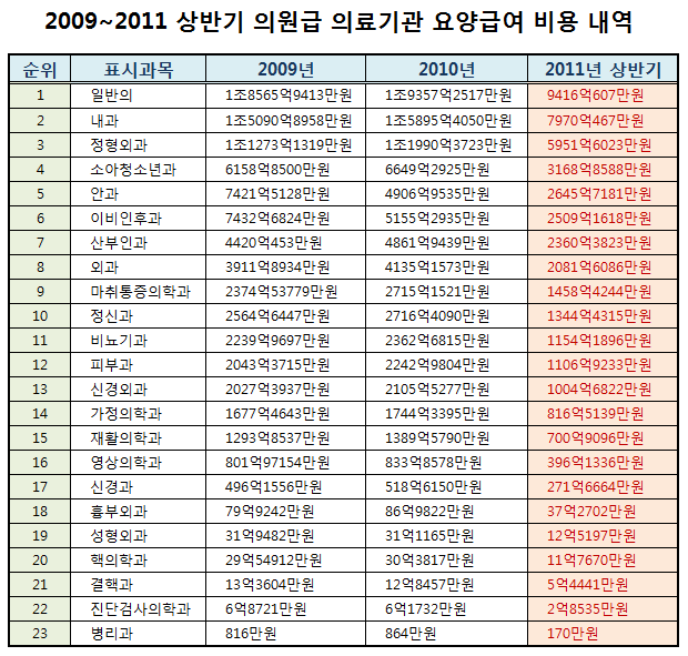 ÃÖ±Ù °Ç°º¸Çè½É»çÆò°¡¿øÀÌ »êÃâÇÑ 2011³â »ó¹Ý±â ÀÇ¿ø±Þ ÀÇ·á±â°ü ¿ä¾ç±Þ¿© ºñ¿ë ³»¿ª ÀÚ·á¿¡ µû¸£¸é 1~7¿ù±îÁö ÀϹÝÀÇ¿¡ Áö±ÞµÈ ±Þ¿©ºñ°¡ 9416¾ï¿ø¿¡ ´ÞÇß´Ù.