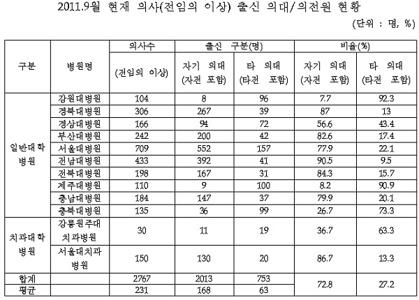 Àü±¹ 12°³ ±¹¸³´ëº´¿ø(ÀϹݺ´¿ø 10°÷, Ä¡°úº´¿ø 2°÷)ÀÇ ÀüÀÓÀÇ ÀÌ»ó ÀÇ»ç 2767¸í °¡¿îµ¥ ¸ð±³ Ãâ½Å ºñÀ²ÀÌ 2013¸íÀ¸·Î 72.8%¿¡ ´ÞÇÏ´Â °ÍÀ¸·Î Á¶»çµÆ´Ù.[Ç¥ ÂüÁ¶]