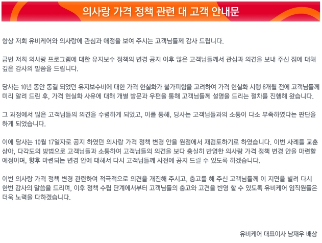 À¯ºñÄɾî´Â ¾È³»¹®À» ÅëÇØ ¡°ÀÇ»ç¶û ÇÁ·Î±×·¥¿¡ ´ëÇÑ À¯Áöº¸¼ö Á¤Ã¥ÀÇ º¯°æ °øÁö ÀÌÈÄ ¸¹Àº °ü½É°ú ÀǰßÀ» ¹Þ¾Ò´Ù. ÀÌ °úÁ¤¿¡¼ ¸¹Àº °í°´°úÀÇ ¼ÒÅëÀÌ ´Ù¼Ò ºÎÁ·ÇÏ´Ù°í ÆÇ´ÜÇÏ°Ô µÆ´Ù¡±¸é¼ ¡°¾ÖÃÊ °øÁöÇß´ø ÀÇ»ç¶û °¡°ÝÁ¤Ã¥ º¯°æ ¾ÈÀ» ¿øÁ¡¿¡¼ Àç°ËÅäÇϱâ·Î Çß´Ù¡±°í ¹àÇû´Ù.