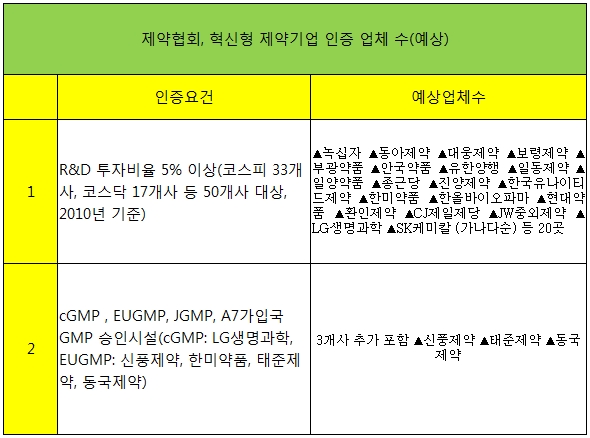 ÀÌ ¼¼ °³ ±âÁØ Áß Çϳª¸¸ Àû¿ëµÅµµ Çõ½ÅÇü Á¦¾à±â¾÷ ¼±Á¤ ¿ä°ÇÀ» °®Ãß°Ô µÇ´Â °ÍÀÌ´Ù. ¼¼ ¹øÂ° ±âÁØÀÇ °æ¿ì Á¦¾àÇùȸ¼ Ãß°¡·Î Á¦½ÃÇØ Á¤ºÎ°¡ ¹Þ¾Æµé¿´´Ù.