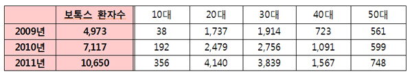 ¿¬·Éº°·Î´Â 20´ë°¡ 38.9%, 30´ë°¡ 36%·Î °¡Àå ¸¹À¸¸ç, 40´ë¿Í 50´ë´Â °¢°¢ 14.7%, 7%·Î ³ªÅ¸³ª, 20´ë¿Í 30´ëÀÇ È¯ÀÚ°¡ Àüü º¸Å彺 ȯÀÚÀÇ 75%¸¦ Â÷ÁöÇß´Ù. ÁøÅ¿µ ¿øÀå(¿µµîÆ÷Á¡)Àº ¡°º¸Å彺ÀÇ °æ¿ì 20´ë¿¡´Â ÁÖ·Î »ç°¢ÅÎÀ̳ª Á¾¾Æ¸®ÀÇ ±ÙÀ°À» Ãà¼ÒÇϱâ À§ÇÑ È¯ÀÚ°¡ ¸¹À¸¸ç, 30´ëºÎÅÍ´Â ÁÖ¸§°³¼±, ź·Â°È µîÀ» À§ÇØ ½Ã¼úÀ» ¿øÇϴ ȯÀÚÀÇ ºñÁßÀÌ Å©´Ù¡±°í ¼³¸íÇß´Ù.
