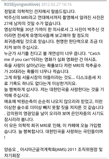 µ¿³²±Ç¿øÀÚ·ÂÀÇÇпø ÇÙÀÇÇÐ/¿µ»óÀÇÇаú ¾ç½Â¿À °úÀå(Àü µ¿³²±Ç¿øÀÚ·ÂÀÇÇпø º´¿øÀå)ÀÌ ¹Ú¿ø¼ø ½ÃÀå ¾ÆµéÀÇ MRI Àç°Ë °á°ú¿¡ ¹®Á¦°¡ ÀÖ´Ù´Â ±ÛÀ» ÀÎÅͳݿ¡ ¿Ã·Á ÆÄÀåÀÌ ÀÏÆÄ¸¸ÆÄ È®´ëµÇ°í ÀÖ´Ù. ±ÛÀÌ ¿Ã·ÁÁø °÷Àº °¿ë¼® ÀÇ¿øÀÇ ÆÒ Ä«Æä ÀÎ °ÍÀ¸·Î È®ÀεƴÙ. [¾Æ·¡ : ¾ç½Â¿À °úÀåÀÇ ±Û Àü¹®]