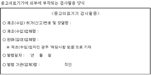 ¼öÀÔ¾÷ÀÚ°¡ Çã°¡ ¶Ç´Â ½Å°íµÈ ÀÇ·á±â±â¸¦ Áß°í·Î ¼öÀÔÇÏ´Â °æ¿ì¿¡µµ ±¹³» ÀÇ·á±â°ü¿¡¼ ±¸ÀÔÇÑ Áß°í±â±â¿Í ¸¶Âù°¡Áö·Î °Ë»çÇÊÁõÀ» ºÎÂøÇØ¾ß ÇÑ´Ù.