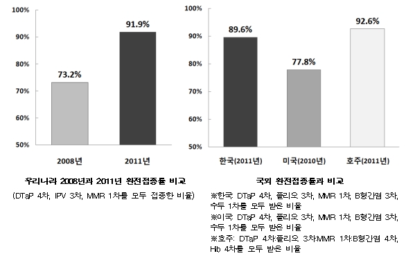 °³º° ¹é½ÅÀÇ Á¢Á¾¿Ï·áÀ²Àº Àü¹ÝÀûÀ¸·Î ³ô¾ÒÀ¸¸ç, ÀÌ Áß¿¡¼µµ ùµ¹ Àü(12°³¿ù)¿¡ Á¢Á¾ÀÌ ³¡³ª´Â ¹é½ÅÀÇ °æ¿ì Á¢Á¾·üÀÌ 98% ÀÌ»óÀ̾úÀ¸³ª, µ¹ ÀÌÈÄ¿¡ ¹Þ´Â Á¢Á¾Àº MMR(1Â÷, 99.2%)À» Á¦¿ÜÇϰí´Â ´Ù¼Ò ³·Àº Á¢Á¾·üÀ» ³ªÅ¸³Â´Ù(DTaP 4Â÷ 93.5%, ÀϺ»³ú¿° 2Â÷, 95.9%).