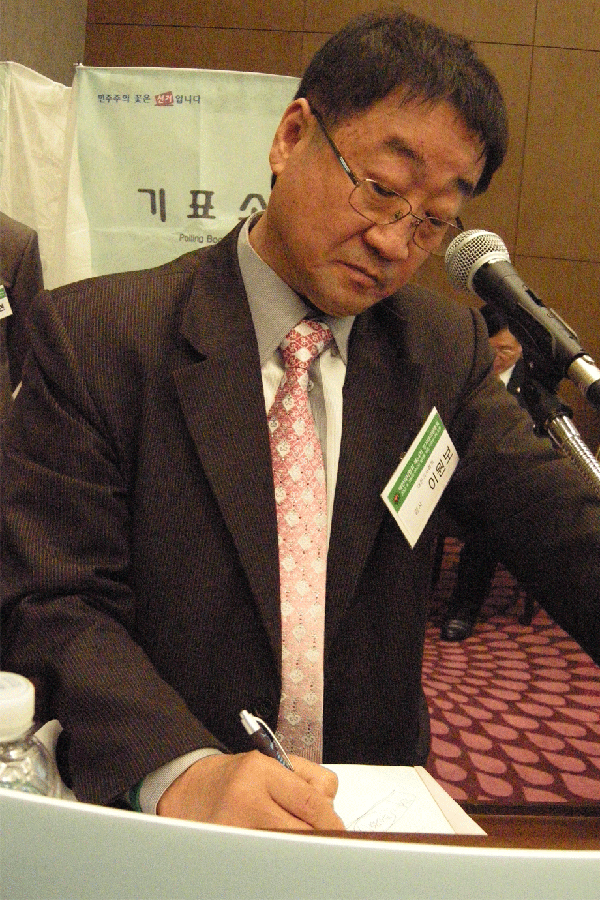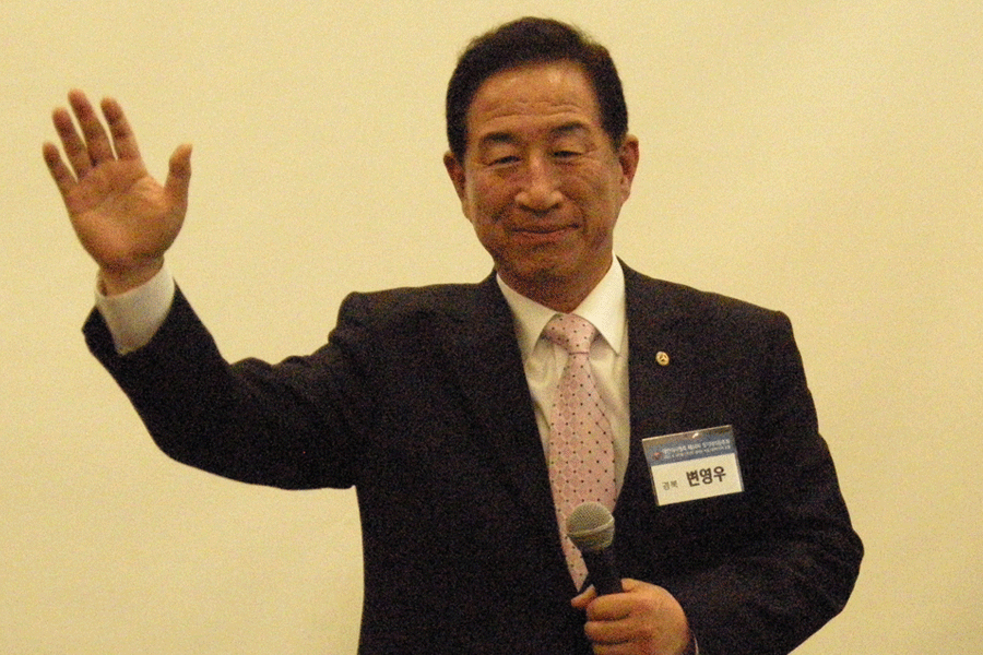 ¡ã´ëÀÇ¿øÈ¸ ÀÇÀå¿¡ ´ç¼±µÈ º¯¿µ¿ì ÀÇÀåÀÌ ¼ÕÀ» µé¾î ÀλçÇϰí ÀÖ´Ù. ÀÇÀå ¼±°Å¿¡´Â ÃÖÁ¾ 4ÀÎÀÌ Âü¿©ÇßÀ¸³ª 1Â÷¿¡ °ú¹ÝÀ» ³Ñ±ä È帰¡ ¾ø¾î 2Â÷ ÅõÇ¥ °á°ú 150Ç¥¸¦ ¾òÀº º¯¿µ¿ì Àü °æºÏÀÇ»çȸÀåÀÌ ´ç¼±µÆ´Ù. |
