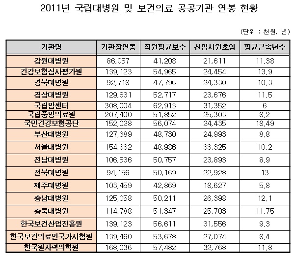 30ÀÏ µ¥Àϸ®¸Þµð°¡ °ø°ø±â°ü °æ¿µÁ¤º¸ °ø°³ ½Ã½ºÅÛ ¾Ë¸®¿À¸¦ ÅëÇØ Àü±¹ ±¹¸³´ëº´¿ø ¹× ÁÖ¿ä º¸°ÇÀÇ·á °ø°ø±â°üÀÇ 2011³â ±â°üÀå ¿¬ºÀÀ» ºñ·Ô Á÷¿ø Æò±Õ º¸¼ö, ½ÅÀÔ»ç¿øÃÊÀÓ, Æò±Õ±Ù¼Ó³â¼ö µîÀ» Áý°èÇÑ °á°ú ÀÌó·³ È®ÀεƴÙ.[Ç¥ ÂüÁ¶]