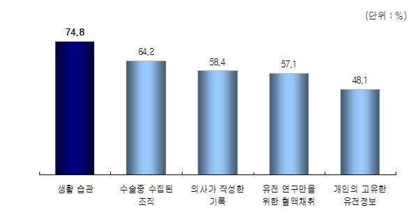 Á¦°ø°¡´ÉÇÑ Á¤º¸¿¡ ´ëÇØ ¡®»ýȰ ½À°ü¡¯ÀÌ 74.8%·Î °¡Àå ³ô¾Ò°í, ¡®¼ö¼ú Áß ¼öÁýµÈ Á¶Á÷¡¯(64.2%), ¡®Áø·á±â·Ï¡¯(58.4%), ¡®Ç÷¾× äÃ롯(57.1%), ¡®À¯ÀüÁ¤º¸¡¯(48.1%) µîÀÇ ¼øÀ¸·Î Áý°èµÆ´Ù.