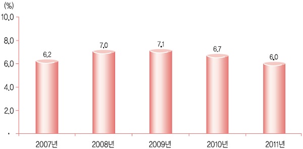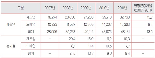¾÷ź°·Î´Â Á¦Á¶¾÷ÀÌ 2009³â(14.3%) ÀÌÈÄ Áö¼ÓÀûÀÎ Ç϶ôÀ» ±â·ÏÇÑ ¹Ý¸é µµ¸Å¾÷ÀÇ °æ¿ì 2009³â –1.7%¿¡¼ 2011³â 3.3%·Î »ó½Â °î¼±À» ±×·È´Ù.