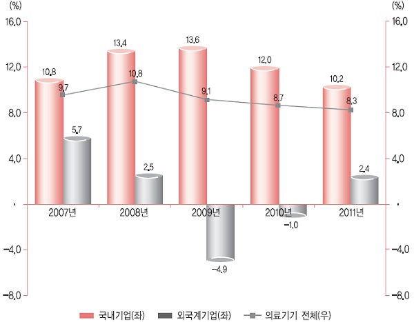 ¿µ¾÷ÀÌÀÍÀÇ Áö¼ÓÀû Ç϶ôÀº ÀÇ·á±â±â Á¦Á¶, ÆÇ¸Å ¾÷ü°¡ 2007³â ÀÌÈÄ ¿¬Æò±Õ 5.8%¾¿ Áõ°¡ÇØ ±¹³» ½ÃÀå°æÀïÀÌ Ä¡¿ÇØÁö°í ÀÖ´Â Á¡ÀÌ Å©°Ô ÀÛ¿ëÇÑ °ÍÀ¸·Î ºÐ¼®µÈ´Ù.