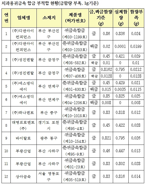 ½ÄǰÀǾàǰ¾ÈÀüûÀº 13ÀÏ ¡°½ÃÁß¿¡ À¯Åë ÁßÀÎ Ä¡°ú¿ë±Í±Ý¼ÓÇÕ±Þ 74°³ Á¦Ç°À» ¼ö°ÅÇØ Á¶¼ººñ ¹× À§ÇØ¿ø¼Ò ÇÔÀ¯ ¿©ºÎ¸¦ °Ë»çÇÑ °á°ú 13°³ ¾÷ü 20°³ Á¦Ç°¿¡ ¹®Á¦°¡ ÀÖ´Â °ÍÀ¸·Î È®Àεƴ١±°í ¹àÇû´Ù.