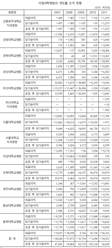 ÀÏ·Ê·Î ºÎ»ê´ëº´¿øÀº ´ç±â¼øÀÌÀÍ ÀûÀÚ°¡ 194¾ï¿øÀÌ ³ÑÁö¸¸ Á¶Á¤ÀÛ¾÷À» °ÅÄ¡¸é 26¾ï8000¸¸¿øÀ¸·Î Å« ÆøÀ¸·Î °¨¼ÒÇß´Ù. ¼¿ï´ëº´¿øÀº ´ç±â¼øÀÌÀÍÀÌ ¸¶À̳ʽº 8¾ï7100¸¸¿øÀÌÁö¸¸, Á¶Á¤ ÀÛ¾÷ ÈÄ¿¡´Â 531¾ï7200¸¸¿øÀÇ ÈæÀÚ¸¦ ³½ °ÍÀ¸·Î Á¶»çµÆ´Ù.