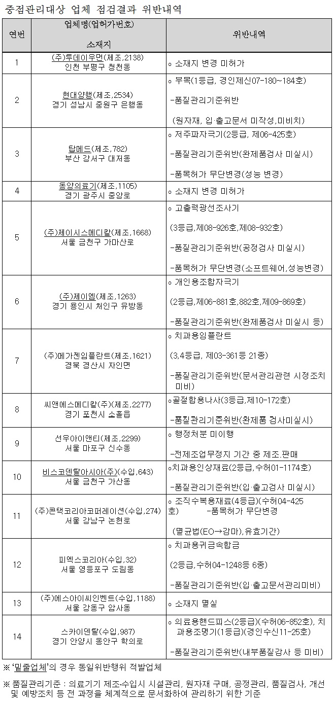 ÀÇ·á±â±â¹ýÀ» »ó½ÀÀûÀ¸·Î À§¹ÝÇØ ÁßÁ¡°ü¸® ´ë»óÀ¸·Î ºÐ·ùµÆÀ½¿¡µµ ÀçÂ÷ ¹ýÀ» ÁؼöÇÏÁö ¾ÊÀº ÀÇ·á±â±â ¾÷ü 14°÷ÀÌ Àû¹ßµÆ´Ù.