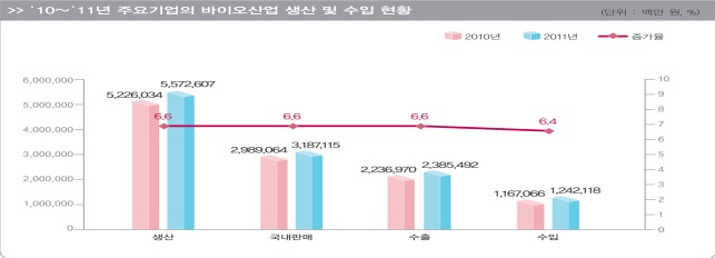 »ý»ê ºÎ¹® ¿ª½Ã 2011³â ¹ÙÀÌ¿À»ê¾÷ ÁÖ¿ä±â¾÷ »ý»ê¾×(±¹³»ÆÇ¸Å+¼öÃâ)Àº ±¹³» ÆÇ¸Å°¡ 3Á¶1871¾ï¿ø, ¼öÃâ 2Á¶3855¾ï¿øÀ¸·Î 2010³â ´ëºñ ¸ðµÎ 6.6% Áõ°¡Çß´Ù. ¼öÀÔµµ 1Á¶2421¾ï¿øÀ¸·Î 2010³â ´ëºñ 6.4% ´Ã¾î³µ´Ù.