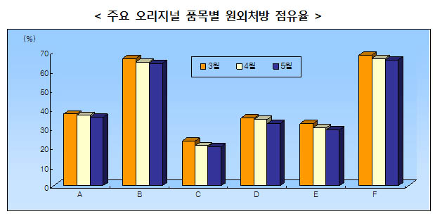 ±¸Ã¼ÀûÀ¸·Î µ¿ÀϼººÐ ³»¿¡¼ ¿À¸®Áö³Î ÀǾàǰÀÇ Ã³¹æ±Ý¾× ºñÁßÀº ǰ¸ñº° ÀÎÇÏÀ²À» ¹Ý¿µÇϸé Àü³â µ¿±â ´ëºñ 4¿ù 1.9% °¨¼Ò¿¡ À̾î 5¿ù¿¡µµ 2.7% °¨¼ÒÇß´Ù. 󹿷®µµ 1.1%(4¿ù), 2.1%(5¿ù) ÁÙ¾ú´Ù.