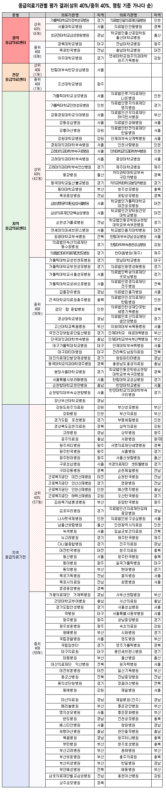 119°³ Áö¿ªÀÀ±ÞÀÇ·á¼¾ÅÍ´Â °¡Å縯´ë ¼º¸ðº´¿ø°ú ÀÎõ¼º¸ðº´¿ø, °µ¿°æÈñ´ëº´¿ø, °¸ª¾Æ»êº´¿ø, °í·Á´ë ºÎ¼Óº´¿ø°ú ±¸·Îº´¿ø, Á߾Ӵ뺴¿ø, µ¿¾Æ´ëº´¿ø, ¼¼ºê¶õ½ºº´¿ø, »ó°è¹éº´¿ø µî 42°³¼Ò°¡ »óÀ§ 40% ±â°üÀ¸·Î Æò°¡µÆ´Ù.