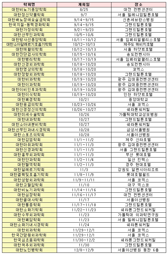 ´ëÇÑÀçȰÀÇÇÐȸ¿Í º´¸®ÇÐȸ, ¿µ»óÀÇÇÐȸ, Á¤Çü¿Ü°úÇÐȸ, ÀÀ±ÞÀÇÇÐȸ, ½Å°æÁ¤½ÅÀÇÇÐȸ, ³»°úÇÐȸ µîÀº 10¿ù Áß ¼¿ï Áö¿ª È£ÅÚ ¹× ÄÁº¥¼Ç¼¾ÅÍ µî¿¡¼ Çмú´ëȸ¸¦ Ä¡¸£°Ô µÈ´Ù.