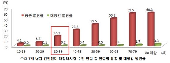 ƯÈ÷ 30´ëÀÇ ¿ëÁ¾ ¹× ´ëÀå¾Ï ¹ß°ßÀ²ÀÌ ±Þ°ÝÈ÷ ³ô¾ÆÁ³´Ù´Â ºÐ¼®ÀÌ´Ù. 30´ë ¿ëÁ¾ ¹ß°ßÀ²Àº 17.9%·Î 20´ëÀÇ ¾à 2.6¹è¿¡ ´ÞÇß´Ù.