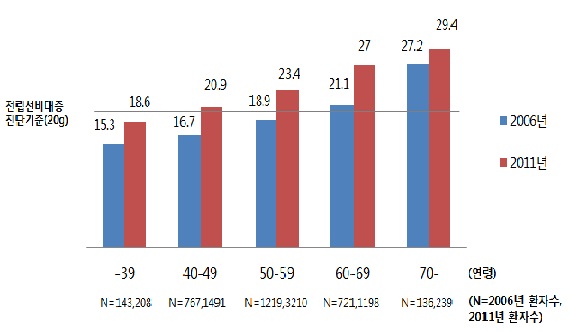 ¶ÇÇÑ 40´ë ³²¼ºµéÀÇ Æò±Õ Àü¸³¼± Å©±â´Â 5³â Àü 16.7gÀ¸·Î Àü¸³¼±ºñ´ëÁõÀ¸·ÎºÎÅÍ ¾ÈÀü Áö´ë¿¡ ¼ÓÇßÁö¸¸ 2011³â¿¡´Â Æò±Õ 20.9gÀ¸·Î Àü¸³¼± ºñ´ëÁõ Áø´ÜÀÌ ³»·ÁÁö´Â ¼öÁØÀ¸·Î Ä¿Á³´Ù. [¾Æ·¡ ±×·¡ÇÁ]
