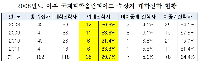 ¿ì¼ö °úÇпµÀç·Î ÀÎÁ¤¹Þ´Â ±¹Á¦°úÇпø²ÇÇ¾Æµå ¼ö»óÀڵ鵵 Àǰú´ëÇп¡ ÁøÇÐÇÏ´Â µî ÀüÅë À̰ø°è¸¦ ±âÇÇÇϰí ÀÖ´Ù´Â ¿ì·Á°¡ Á¦±âµÆ´Ù.
