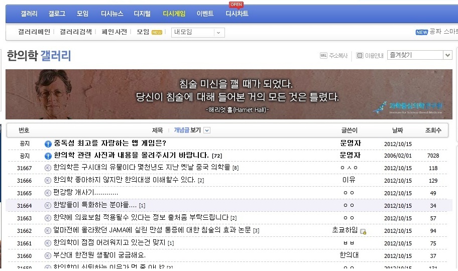 ¿¬±¸¿øÀº ħ, ¶ä °°Àº ´ëüÀÇÇÐÀÌ È¿°ú°¡ ¾ø´Ù´Â ³í¹®À» ¹ø¿ª¤ý¹èÆ÷Çϰí ÀÖÀ¸¸ç Áö³ 10ÀÏ¿¡´Â ¡®°úÇÐÀÌ ÇÑÀÇÇп¡ ¹Ý´ëÇÏ´Ù¡¯´Â Ã¥ÀÚ¸¦ ¿Â¶óÀÎÀ¸·Î ¹ß°£Çß´Ù. À¯¸í ÀÎÅÍ³Ý Ä¿¹Â´ÏƼ µð½ÃÀλçÀ̵å¿Í ÀÎÅÍ³Ý ¸Åü ºò´º½º µî¿¡ ±¤°íµµ ½Æ°í ÀÖ´Ù. ¡®Ä§¼ú ¹Ì½ÅÀ» ±ý ¶§°¡ µÆ´Ù. ´ç½ÅÀÌ Ä§¼ú¿¡ ´ëÇØ µé¾îº» °ÅÀÇ ¸ðµç °ÍÀº Ʋ·È´Ù¡¯, ¡®´ëüÀÇÇÐ °°Àº °ÍÀº »ç½Ç ¾ø´Ù. È¿°ú°¡ ÀÖ´Â ÀÇÇаú ±×·¸Áö ¾ÊÀº ÀÇÇÐÀÌ ÀÖÀ» »ÓÀÌ´Ù¡¯´Â ³»¿ëÀÇ ±¤°í´Â ÇÑÆ¯À§°¡ ¿À¸£ºñ¿¡ ¿Ã¸° ±¤°í¿Í °°Àº ³»¿ëÀÌ´Ù.