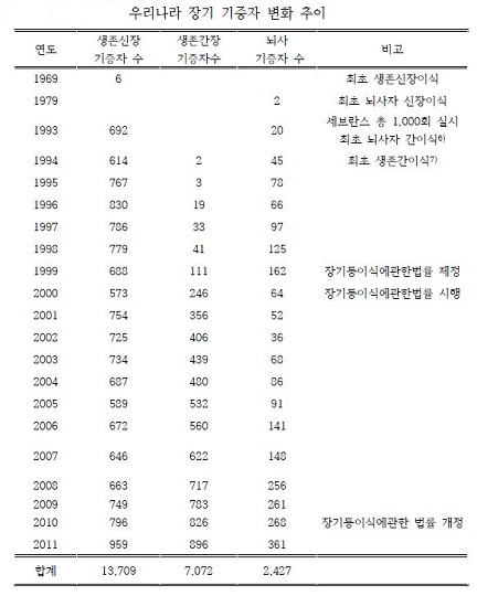 2011³âµµ Àå±â±âÁõÀÚ´Â ÃÑ 2496¸íÀ¸·Î ÀÌÁß ³ú»ç ±âÁõÀÚ°¡ 361¸í, ³ú»çÀÚ·Î °ü¸® Áß ½ÉÀå»ç ÈÄ Àå±â ±âÁõÀÚ(NHBD) 7¸í, »çÈÄ ±âÁõÀÚ 131¸í µîÀÎ ¹Ý¸é »ýÁ¸ ½Ã ±âÁõÀÚ´Â 1997¸í¿¡ ´ÞÇß´Ù.