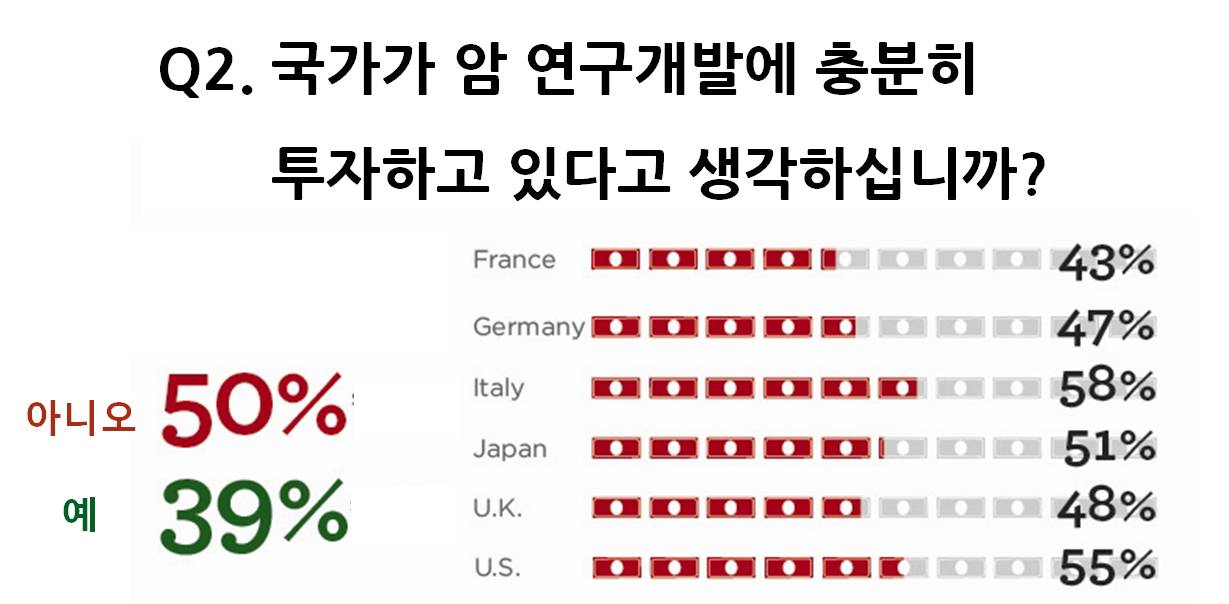 "±¹°¡°¡ ¾Ï ¿¬±¸°³¹ß¿¡ ÃæºÐÈ÷ ÅõÀÚÇϰí ÀÖ´Ù°í »ý°¢ÇÏ´À³Ä"ÀÇ Áú¹®¿¡´Â 50%ÀÇ ÀÀ´äÀÚ°¡ '¾Æ´Ï¿À'¶ó°í ´ë´äÇß´Ù.