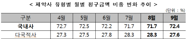 ¸ð´ÏÅ͸µ °á°ú, ¾à°¡ÀÎÇÏ ÈÄ Áõ°¡ÇÏ´ø ´Ù±¹Àû»ç û±¸±Ý¾×Àº 8¿ù ÀÌÈÄ °¨¼ÒÇß´Ù. ´Ù±¹Àû»çÀÇ Ã»±¸±Ý¾× ºñÁßÀÌ ÀϺΠÁõ°¡ÇßÁö¸¸ ÃÖ±Ù °¨¼Ò Ãß¼¼·Î µ¹¾Æ¼¹´Ù.