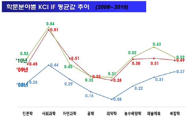 Àι®ÇÐÀº 2008³â 0.26, 2009³â 0.45, 2010³â 0.52¸ç »çȸ°úÇÐÀº 2008³â 0.44, 2009³â 0.81, 2010³â 0.84´Ù.