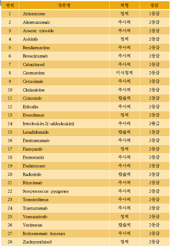 28°³ ¼ººÐ ÀӺαݱâ ÀǾàǰÀº ¡ãAbiraterone Á¤Á¦ 1µî±Þ ¡ãAlemtuzumab ÁÖ»çÁ¦ 2µî±Þ ¡ãArsenic trioxide ÁÖ»çÁ¦ 2µî±Þ ¡ãAxitinib Á¤Á¦ 2µî±Þ ¡ãBendamustine ÁÖ»çÁ¦ 2µî±Þ ¡ãBevacizumab ÁÖ»çÁ¦ 2µî±Þ ¡ãCabazitaxel ÁÖ»çÁ¦ 2µî±Þ ¡ãCarmustine À̽ÄÁ¤Á¦ 2µî±Þ ¡ãCetuximab ÁÖ»çÁ¦ 2µî±Þ ¡ãClofarabine ÁÖ»çÁ¦ 2µî±Þ ¡ãCrizotinib ĸ½¶Á¦ 2µî±Þ ¡ãEribulin ÁÖ»çÁ¦ 2µî±Þ ¡ãEverolimus Á¤Á¦ 2µî±Þ ¡ãInterleukin-2(=aldesleukin) ÁÖ»çÁ¦ 2µî±Þ ¡ãLenalidomide ĸ½¶Á¦ 1µî±Þ ¡ãPanitumumab ÁÖ»çÁ¦ 2µî±Þ ¡ãPazopanib Á¤Á¦ 2µî±Þ ¡ãPentostatin ÁÖ»çÁ¦ 2µî±Þ ¡ãPralatrexate ÁÖ»çÁ¦ 2µî±Þ ¡ãRadotinib ĸ½¶Á¦ 2µî±Þ ¡ãRituximab ÁÖ»çÁ¦ 2µî±Þ ¡ãStreptococcus pyogenes ÁÖ»çÁ¦ 2µî±Þ¡ãTemsirolimus ÁÖ»çÁ¦ 2µî±Þ ¡ãTrastuzumab ÁÖ»çÁ¦ 2µî±Þ ¡ãVemurafenib Á¤Á¦ 2µî±Þ ¡ãVorinostat ĸ½¶Á¦ 2µî±Þ ¡ãIbritumomab tiuxetan ÁÖ»çÁ¦ 2µî±Þ ¡ãZuclopenthixol Á¤Á¦ 2µî±Þ µîÀÌ´Ù.