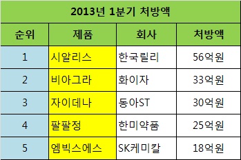 ºñ¾Æ±×¶ó(ÈÀÌÀÚ)¿Í ½Ã¾Ë¸®½º(Çѱ¹¸±¸®), ÀÚÀ̵¥³ª(µ¿¾ÆST), ¿¥ºò½º(SKÄɹÌÄ®), Á¦Çǵå(JWÁß¿ÜÁ¦¾à) µî ±¹³»¡¤¿Ü ¿À¸®Áö³Î Á¦Ç°µé »çÀÌ¿¡¼ ÆÈÆÈÁ¤Àº Á¦³×¸¯ÀÌÁö¸¸ ó¹æ¾× ¼±µÎ±Ç ÇàÁøÀ» º¸À̰í ÀÖ´Ù.[ß¾ ÀÚ·á IMS 1ºÐ±â µ¥ÀÌÅÍ, µ¥Àϸ®¸Þµð ºÐ¼®]