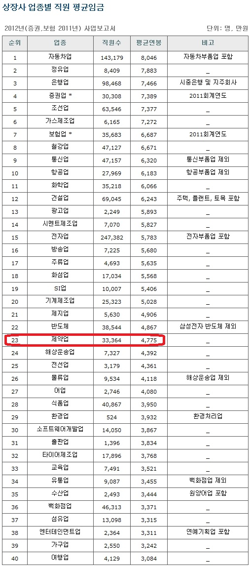 ÃÖ±Ù Àç¹ú´åÄÄ¿¡ µû¸£¸é Á¦¾à¾÷Á¾Àº ¡®¾÷Á¾º° Á÷¿ø Æò±Õ¿¬ºÀ¡¯ ºÎºÐ¿¡¼ Àüü 40°³ »ê¾÷ Áß, 23À§(4775¸¸¿ø)¸¦ Â÷ÁöÇß´Ù. ¹Ý¸é Á÷¿ø ¼ö´Â 13À§(3¸¸3364¸í)·Î °¢±â »ó¹ÝµÈ ¾ç»óÀ» ³ªÅ¸³Â´Ù.[ù» ÀÚ·á Àç¹ú´åÄÄ]