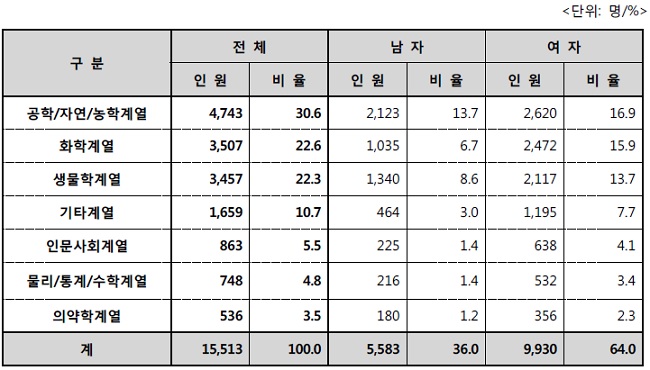 °øÇÐ/ÀÚ¿¬/³óÇÐ°è¿ Áö¿øÀÚ°¡ ÃÑ 4743¸í(30.6%)À̳ª µÆÀ¸¸ç ÈÇÐ°è¿ 3507¸í(22.6%), »ý¹°ÇÐ°è¿ 3457¸í(22.3%), Àι®»çȸ°è¿ 863¸í(5.5%), ¹°¸®/Åë°è/¼öÇÐ°è¿ 748¸í(4.8¸í), ÀǾàÇÐ°è¿ 536¸í(3.5%) ¼øÀÌ´Ù.