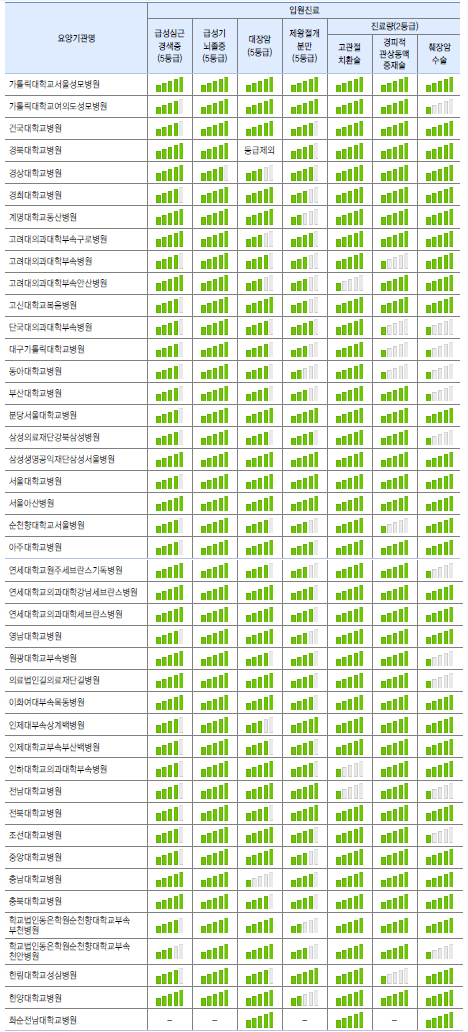 Æò°¡ Ç׸ñº° µî±Þ ºÐ·ù´Â ±Þ¼º½É±Ù°æ»öÁõ°ú ±Þ¼º±â ³úÁ¹Áß, ´ëÀå¾Ï, ÀÇ·á±Þ¿©Á¤½Å°ú, ¾àÁ¦±Þ¿©, À¯¼Ò¾Æ±Þ¼ºÁßÀÌ¿°Ç×»ýÁ¦, ¿Ü·¡Ã³¹æ¾àǰºñ´Â 5µî±ÞÀ¸·Î ºÐ·ùÇϰí, Á¦¿ÕÀý°³ºÐ¸¸Àº ¿¬°£ ºÐ¸¸°Ç¼ö°¡ 200°Ç ÀÌ»ó µÇ´Â »ó±ÞÁ¾ÇÕº´¿øÀ» 5µî±ÞÀ¸·Î Æò°¡Çß´Ù.