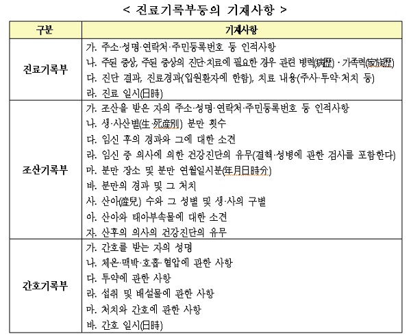 ÀÇ·á¹ý ½ÃÇà±ÔÄ¢ °³Á¤·É¾È¿¡ µû¸£¸é Áø·á±â·ÏºÎ ±âÀç»çÇ×ÀÌ ±¸Ã¼ÈµÈ´Ù. ÇöÇà ½ÃÇà±ÔÄ¢¿¡ ¼¼ºÎÇ׸ñÀÌ ±ÔÁ¤µÅ ÀÖÀ¸³ª, ¹ý·ü¿¡ À§ÀӱٰŰ¡ ¸¶·ÃµÅ ÀÇ·áÀÎÀº ¼¼ºÎÇ׸ñÀ» ¹Ýµå½Ã ±âÀçÇØ¾ß ÇÏ´Â È¿°ú°¡ »ý°å´Ù.